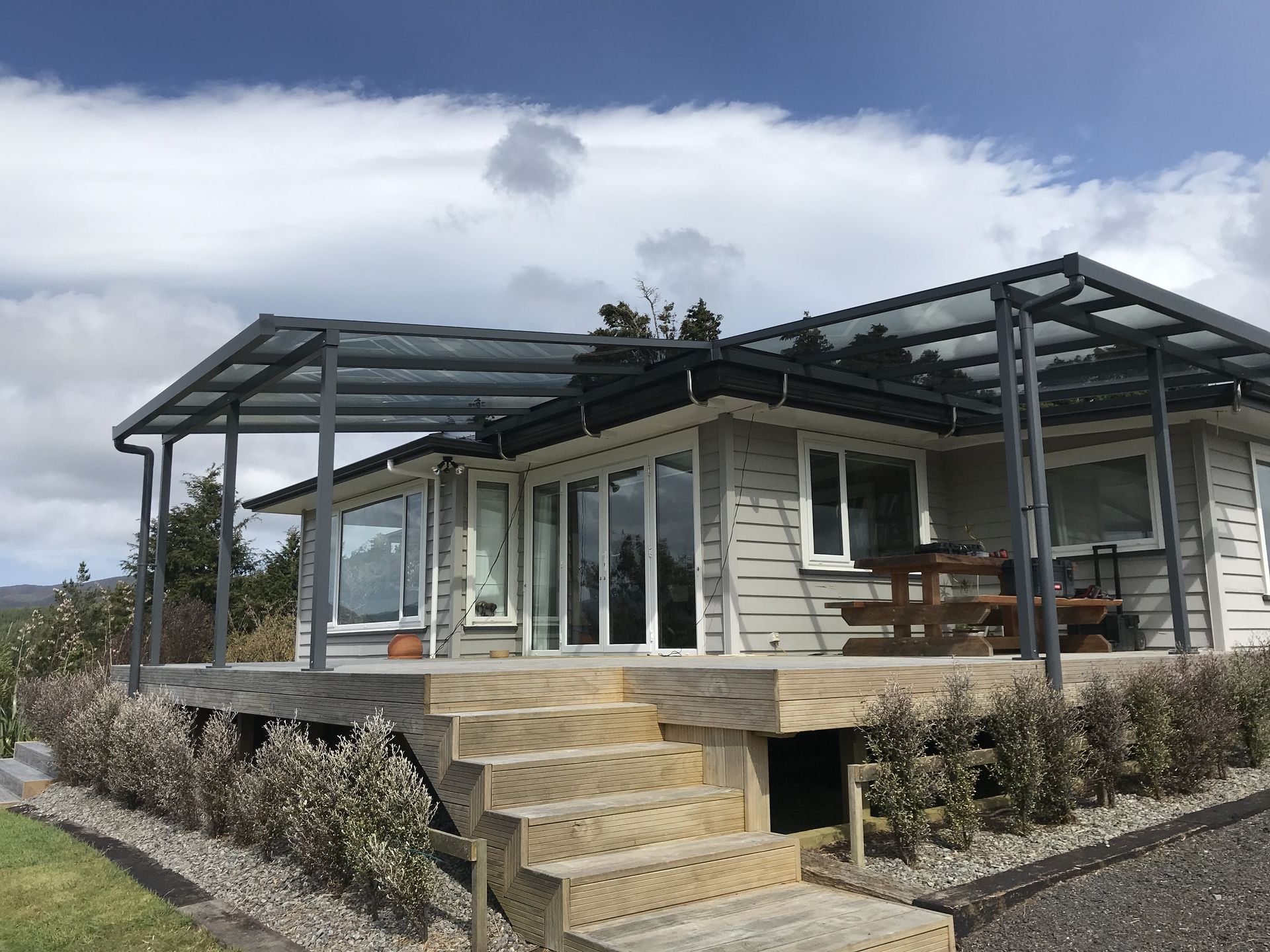 In the hills north of Wellington, a home now enjoys all-weather outdoor spaces with six Flexiroof shelters. These modular structures provide coverage while maintaining flexibility.