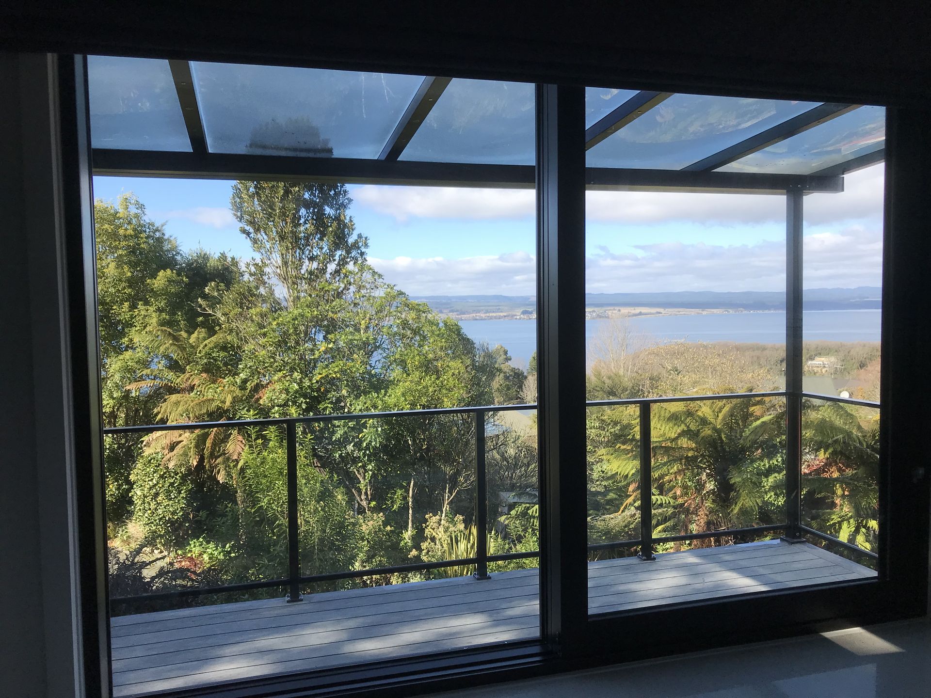 Picture this: standing at the threshold of a tiny home, the doors wide open, a Flexiroof shelter extending over the deck. Beyond, the shimmering waters of Lake Taupō stretch into the horizon, framed by the sleek, transparent design of the roof above.